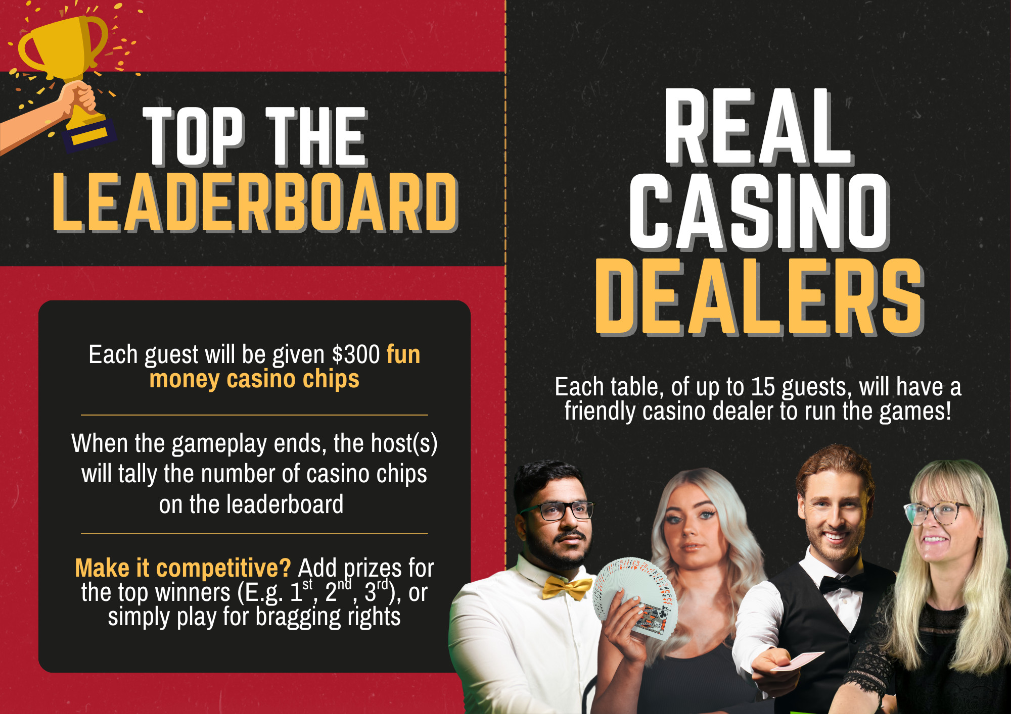 Bring the energy of the casino straight to your remote team with our Virtual Roulette Experience! Perfect for virtual team-building, client entertainment, or company socials, this engaging and easy-to-learn game creates a fun, interactive environment where colleagues can connect, compete, and unwind.